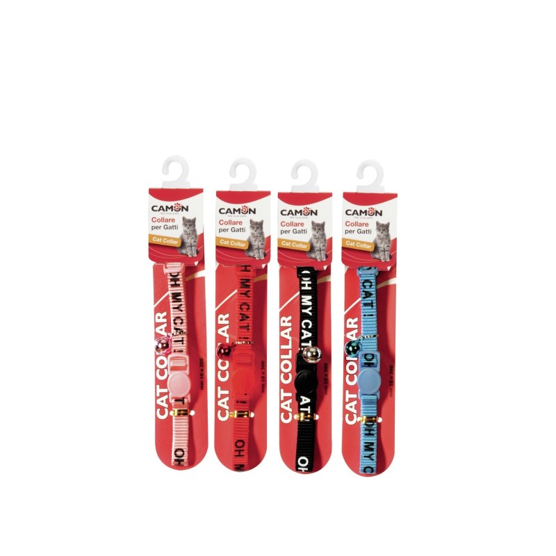 Nylon collar with printed writing "Oh My Cat" and bell.Available in red, black, pink and light-blue. Camon brand.Cat collar.